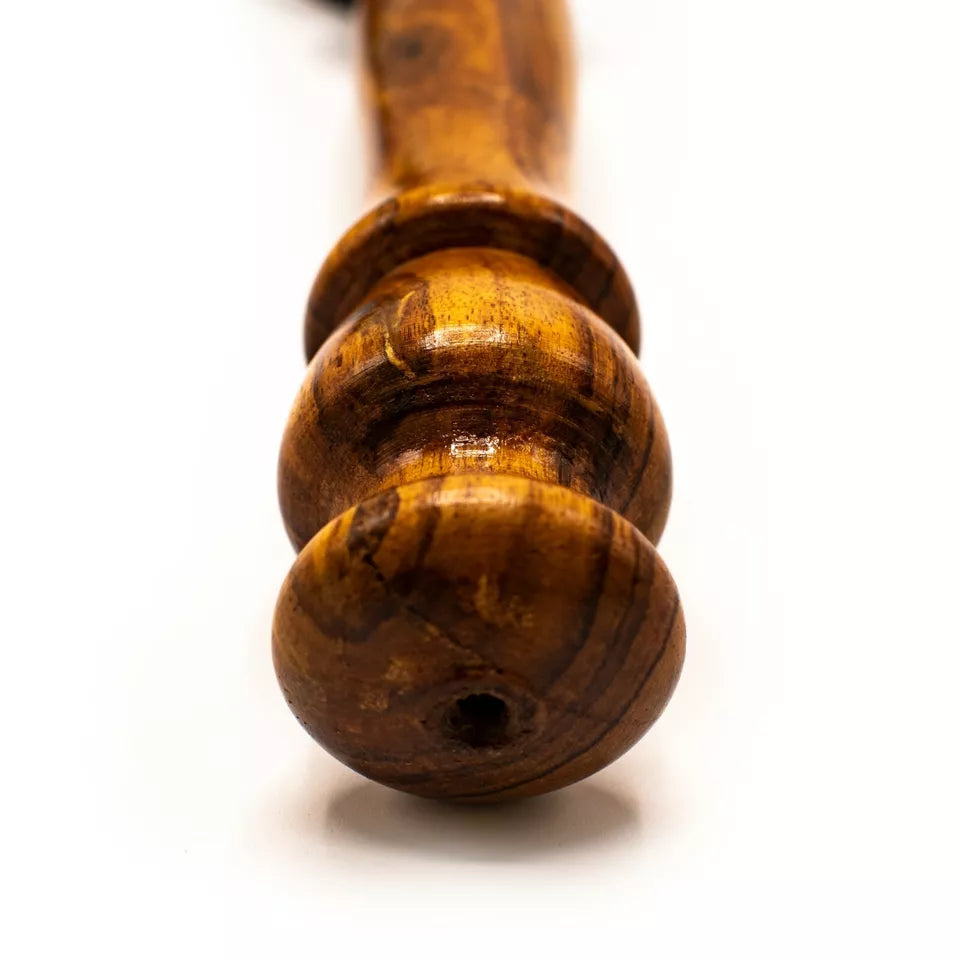 A 9-inch long, polished, solid wood handle ensures a secure and comfortable grip. The intricate carving and braided leather knob enhance its aesthetic appeal.